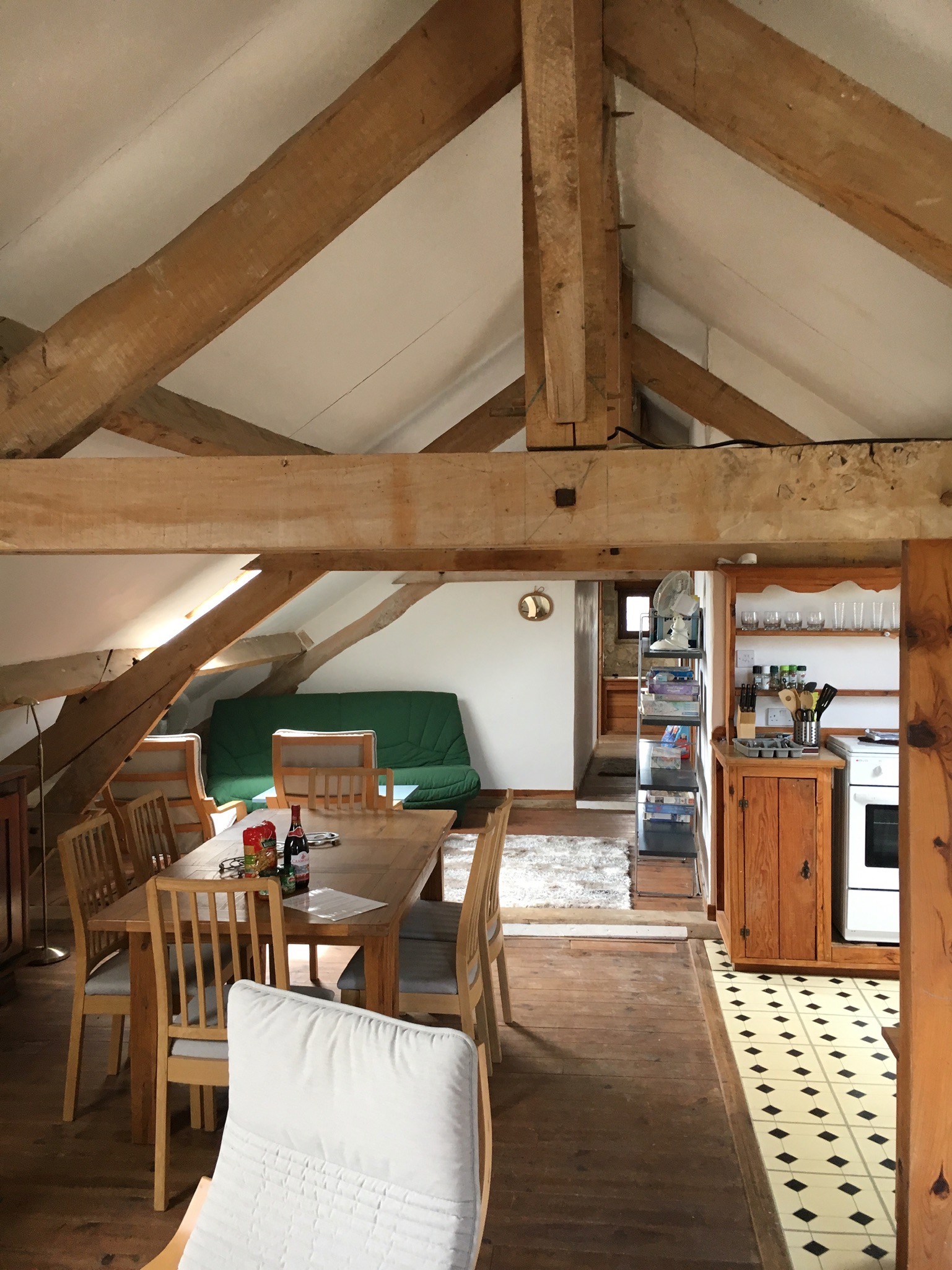 This three bedroom apartment is situated upstairs, above Petite Maison, with skylights giving a large amount of light, illuminating the traditional wood floors and large oak beams.